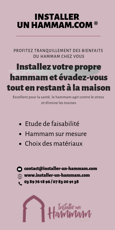 C’est donc pour faire découvrir au plus grand nombre cette pratique bien-être unique que Fatima Mimouni a créé le site Installer-Un-Hammam.com. Elle y propose des services de conseil et d’études de faisabilité aux particuliers et aux professionnels qui ont envie de profiter d’un hammam privé.