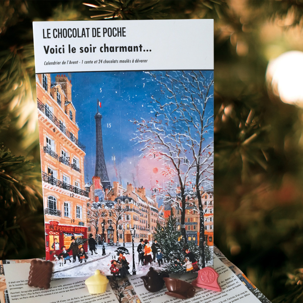 Le calendrier de l’Avent du Chocolat de Poche a pour titre « Voici le soir charmant… » Le conte est reproduit dans un livret glissé dans la fente de la boîte. Chaque jour, pendant 24 jours, le calendrier réserve des surprises : des chocolats en forme d’horloge, théière, tasse, biscuit, et pâtisserie qui rappellent pour certains l’univers d’Alice au pays des merveilles ou l’heure du thé, tout simplement.