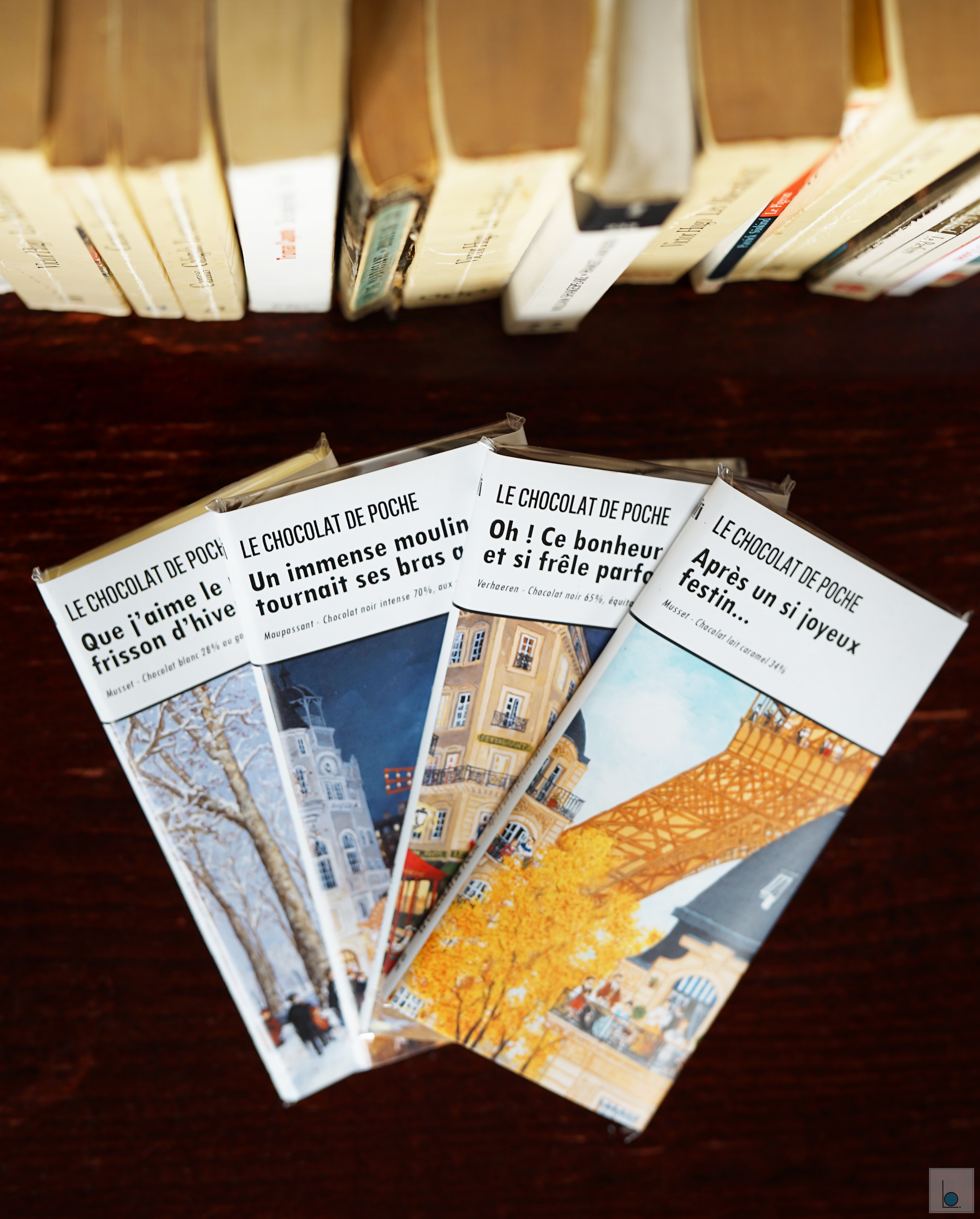 Les tablettes de chocolat du Chocolat de poche sont uniques, parce qu’elles allient le plaisir gustatif, la découverte littéraire avec la présence de texte à l’intérieur de chaque emballage, et enfin artistique : des œuvres picturales habillent chaque couverture grâce à des collaborations avec musées, peintres et photographes.