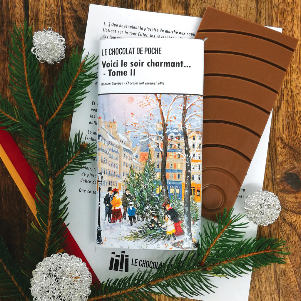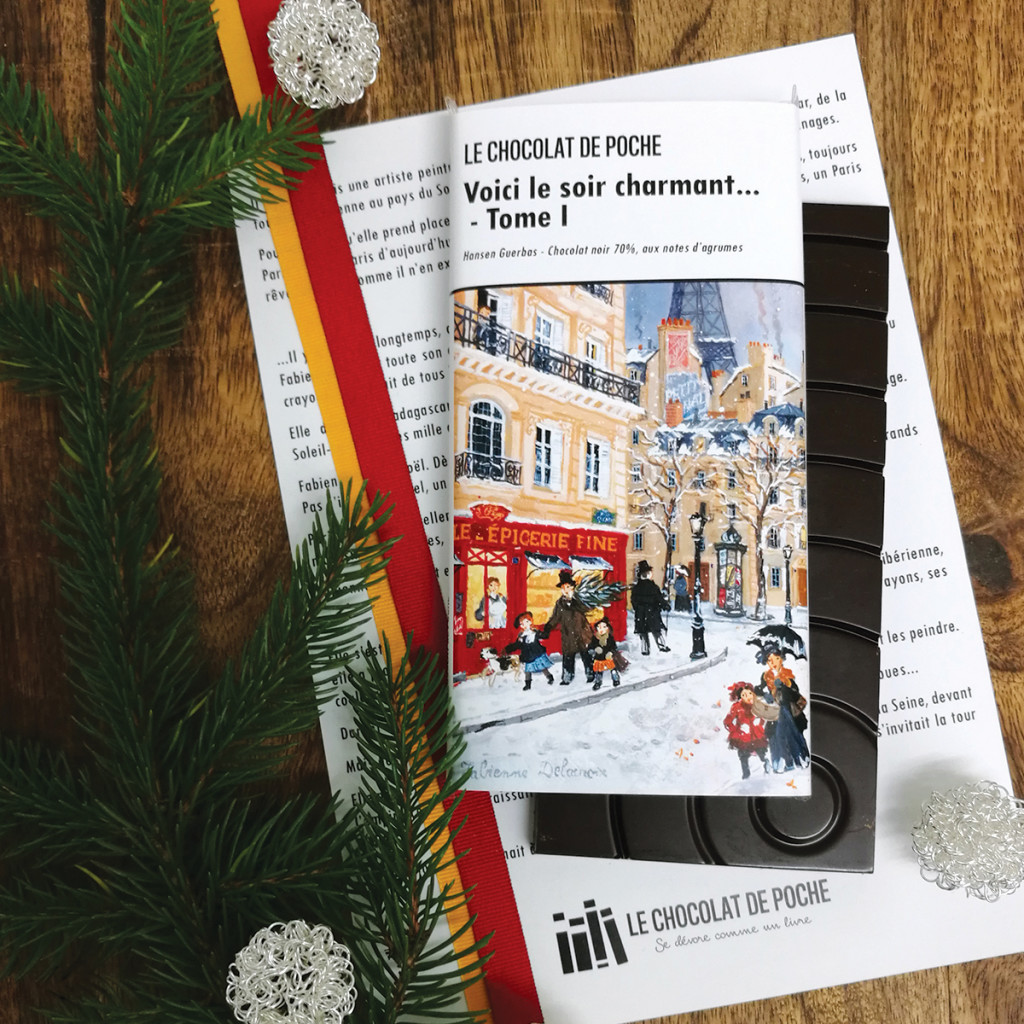 Dans le même esprit que le calendrier de l’Avent, le Chocolat de Poche propose deux tablettes de chocolat reprenant le tableau signé Fabienne Delacroix. Celui-ci est réparti sur la couverture de deux tablettes, qui, mises côte à côte, dévoilent l’œuvre complète.