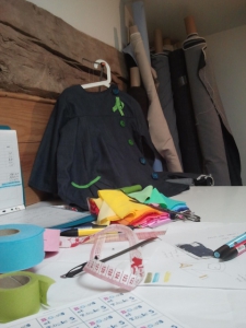 Dans son atelier de la région lyonnaise, elle dessine et réalise le patronage de chaque modèle avant d’en confier la confection à un atelier de production français.