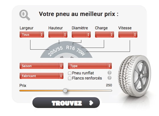 Référençant plus de 10 marchands spécialistes de la vente de pneus online, Trouve-ton-pneu.fr permet en 3 clics de trouver la meilleure offre, parmi le plus grand catalogue de pneus virtuel avec plus de 100 000 offres de pneus mis à jours quotidiennement… Un véritable gain de temps et d’argent !
