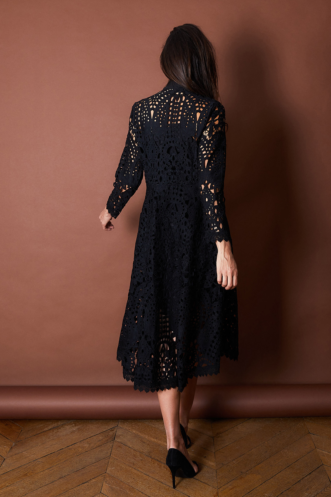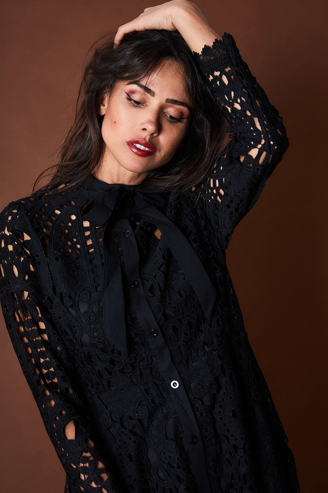 Leane est une robe élégante en guipure à l’allure féminine et sexy. Elle a une forme patineuse, avec une longueur sous le genou, et un col arrondi agrémenté d’un nœud en coton. Sa doublure en coton, sur le devant, dévoile subtilement la transparence sur les bras et à partir du genou. Elle se porte aussi bien en soirée qu’en journée.