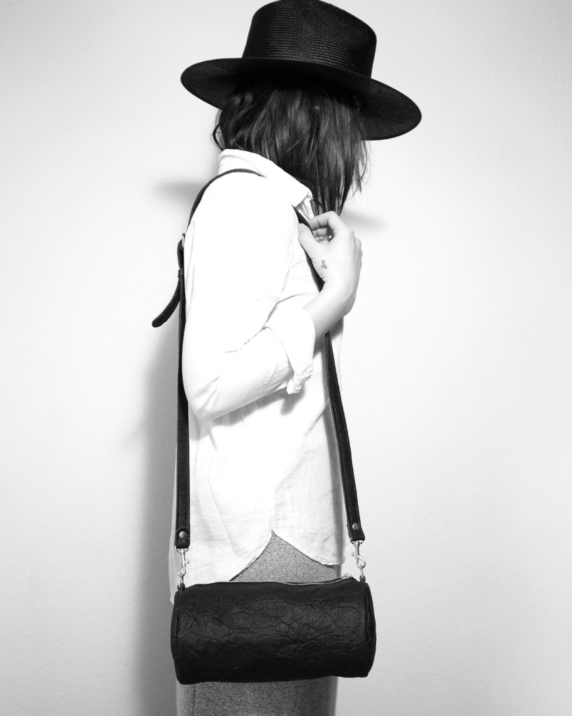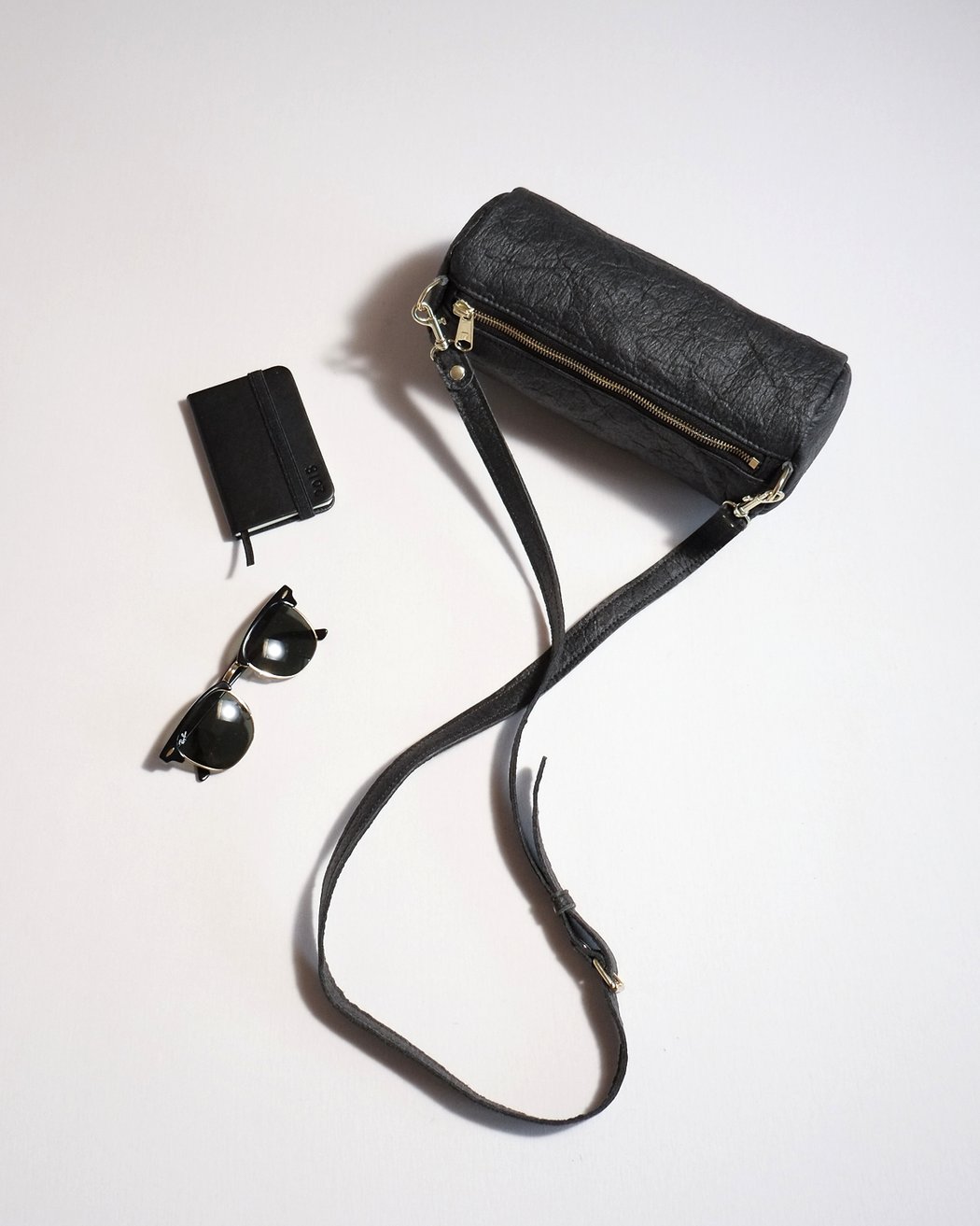 Felix est un joli sac cylindrique équitable noir fait en Piñatex. Il se ferme par un zip et possède une anse réglable en textile végétal. Il est fabriqué artisanalement en Allemagne.