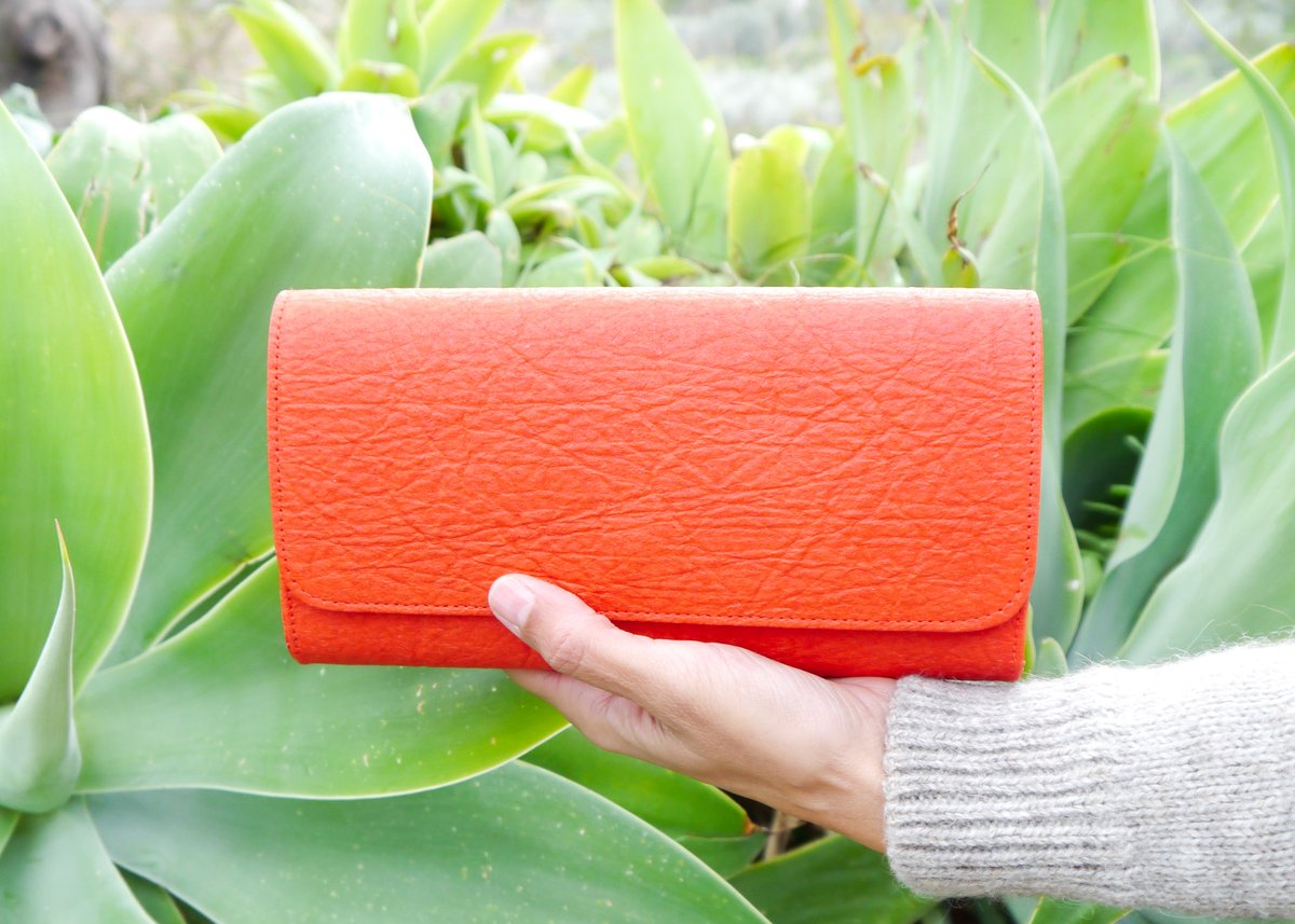 Les fibres utilisées sont issues des feuilles, partie non comestible du fruit. Ce sous-produit de l’industrie agricole n’utilise pas de terre, d’eau ou de pesticides supplémentaires, et ne contient aucun produit chimique ou animal.