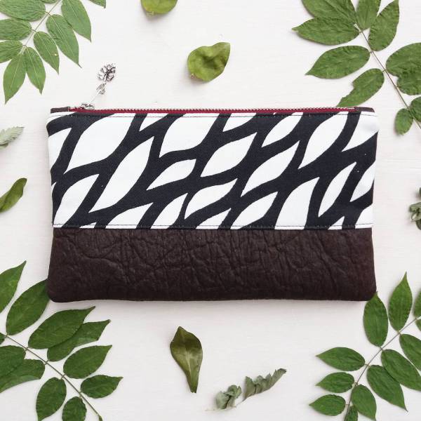Capucine est une pochette fabriquée en Piñatex, avec une doublure en coton biologique. Les motifs sont imprimés avec une encre noire non toxique, sans PVC et sans phtalates. Elle est fabriquée artisanalement en Belgique, se ferme par un zip et est dotée d’une poche intérieure.