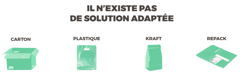 Le carton est souvent à usage unique, incapable de s’adapter à la forme de l’objet, pour un coût carbone de transport et de transformation important. Le kraft n’est pas assez résistant, les sacs en tissus trop coûteux et toujours à base de coton (donc peu écologique), tandis que les Repack doivent être renvoyés par le client lui-même puis inspectés dans des locaux en Estonie avant de pouvoir être réutilisés…