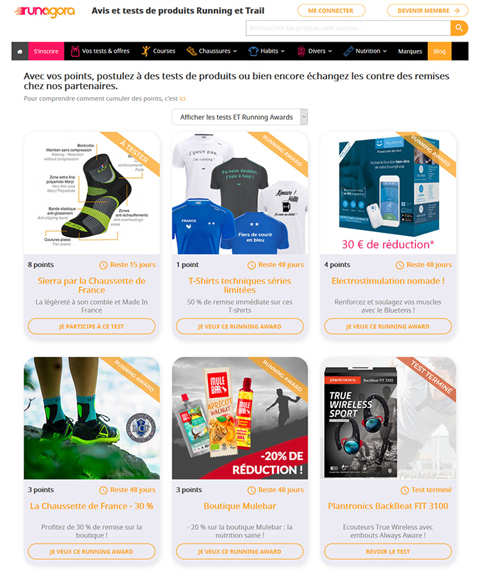L’inscription est gratuite, et la contribution des membres est valorisée et récompensée par des points qui permettent de bénéficier d’avantages : tests gratuits de produits et tests à des conditions privilégiées mais également d’avantages réservés aux membres avec de jolies remises, coupons de réductions, et dossards gratuits pour des courses.