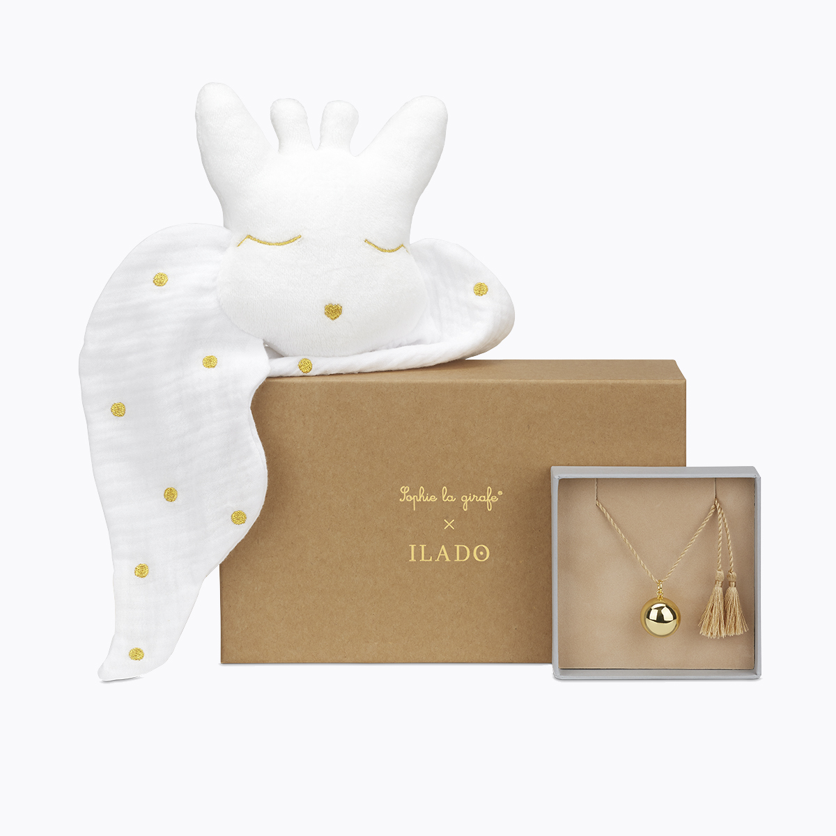 En collaboration avec la célèbre marque de jouets bébé « Sophie La Girafe », ILADO a développé un coffret complet pour faire le bonheur de chaque future maman. Ce coffret comprend :