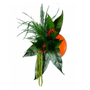 Elle est composée de céramique émaillée et de lierre, de sala, de tiki, d’amarante et de phylica orange. Dimensions : 15 cm x 15 cm.