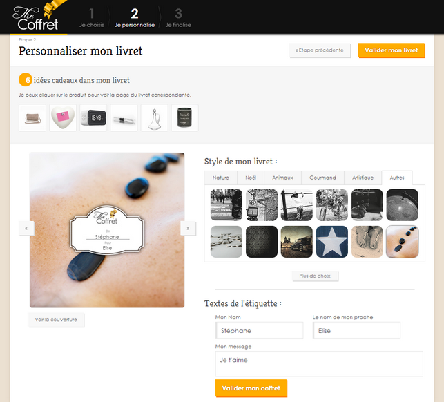 Lorsque votre box est composée, vous choisissez le style de votre livret (nature, artistique, gourmand….), puis vous personnalisez le contenu avec votre nom, celui du bénéficiaire de la box et un message que vous écrivez librement. A chaque étape, vous pouvez prévisualiser le livret. Lorsque vous êtes satisfait(e) du résultat obtenu, vous validez votre commande et le tour est joué !