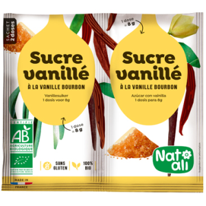 Le sucre vanillé Nat’Ali est issu d’une recette et savoir-faire centenaire chez NATURE ET ALIMENTS. L’entreprise a privilégié le goût en utilisant un extrait de vanille Bourbon pour ses qualités aromatiques et utilise de la poudre de gousses de vanille non épuisées pour enrichir la puissance aromatique de la vanille. Le sucre roux en gros grains apporte du croquant dans les desserts et sa grosseur permet une bonne imprégnation de l’extrait de vanille. Ni amidon de maïs ou de blé, juste l’essentiel du sucre de canne et de la vanille Bourbon.
