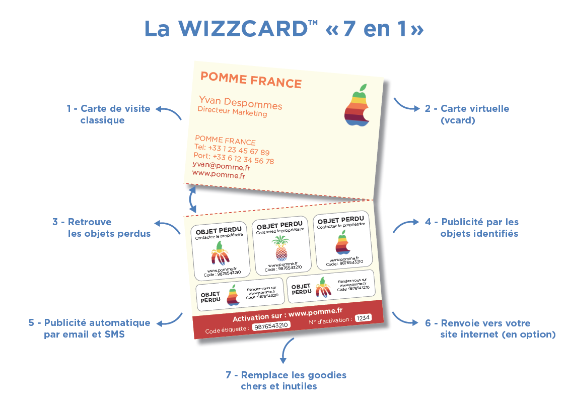 A la fois carte de visite traditionnelle et carte virtuelle au format vcf, la Wizzcard comprend également pour les utilisateurs, un service qui permet de retrouver ses objets en cas de perte et pour les professionnels, un puissant outil de communication.