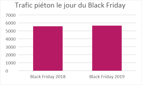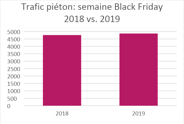 Le nombre moyen de piétons dans les rues de Paris pendant la semaine du Black Friday 2019 a été de 4.867 piétons par jour par rapport à la même semaine de l’année dernière où le nombre moyen de piétons a été de 4.764 personnes, ce qui représente une augmentation de 2,17%.