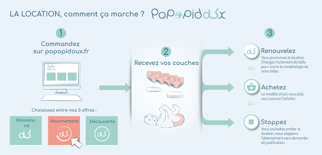 Popopidoux est la seule à proposer une location multi-marques à l’unité sur un site e-commerce. Le client choisi ses modèles, ses accessoires, remplit son panier, règle son premier mois de location et reçois ses couches. À la fin du mois, il est invité soit à renouveler pour un second mois, soit à renvoyer son lot.