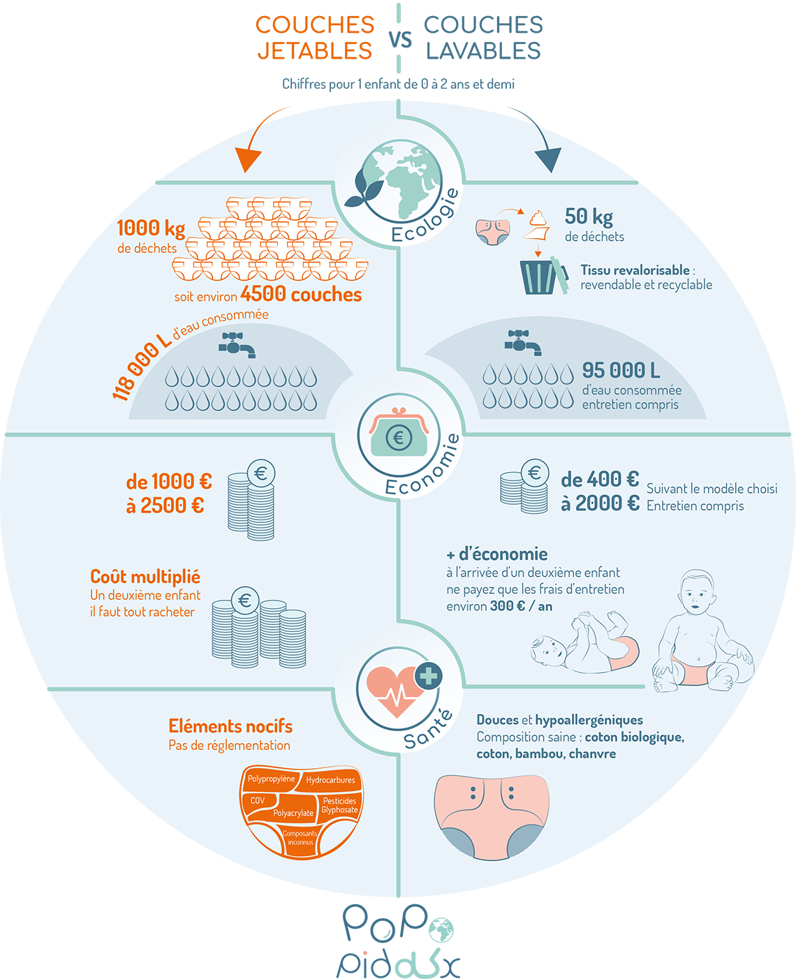 Ce n’est plus une nouvelle : les 4 500 couches jetables utilisées par un seul enfant génèrent en moyenne 1 tonne de déchets, consomment plus de 100 000 L d’eau, sans compter qu’elles constituent un véritable gouffre financier pour les parents. Dans ce contexte, la démocratisation de l’utilisation des couches lavables apparaît comme une solution plus écologique.