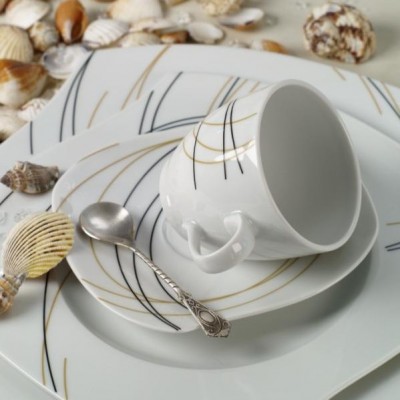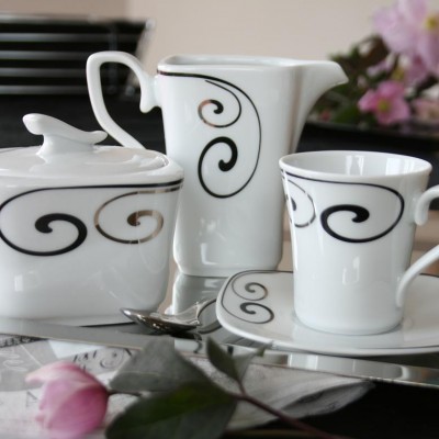 Ce service de porcelaine blanche met à l’honneur les formes carrées. Sobre avec ses touches décoratives noires et platine, il est apprécié pour les listes de mariage et se marie facilement avec d’autres couleurs.