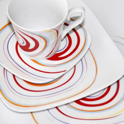 Le service Tourbillon fruité a pour fil conducteur une spirale aux couleurs vives. Contemporain et plein de fantaisie, il est composé de plats rectangulaires et d’assiettes aux formes carrées. Il décore les tables de fêtes et de repas de famille, et passe au lave-vaisselle et au micro-ondes.