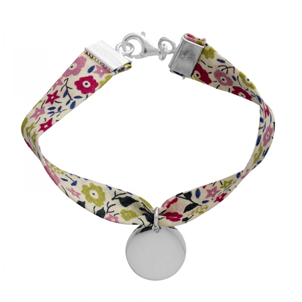 En tissu liberty avec motif, perle ou petite médaille en argent à graver, ce bracelet est entièrement personnalisable avec 14 liberty au choix et la gravure recto ou recto/verso de la médaille.