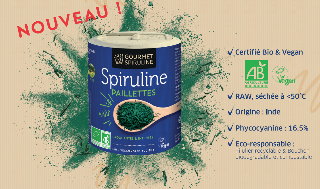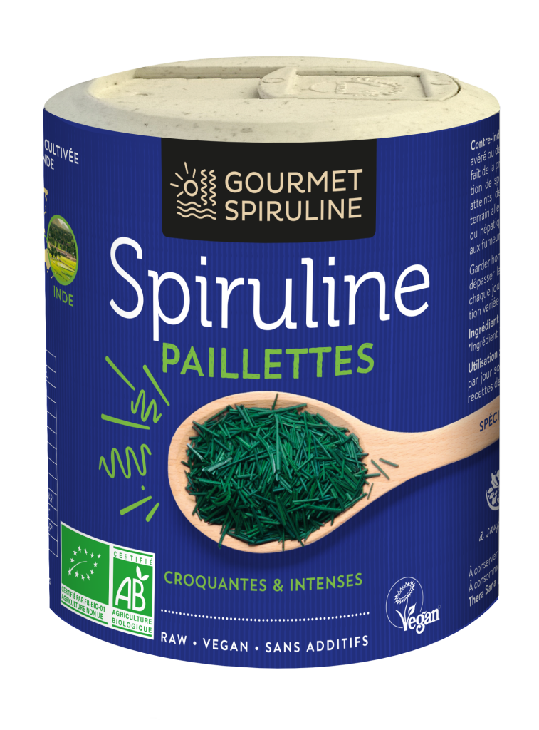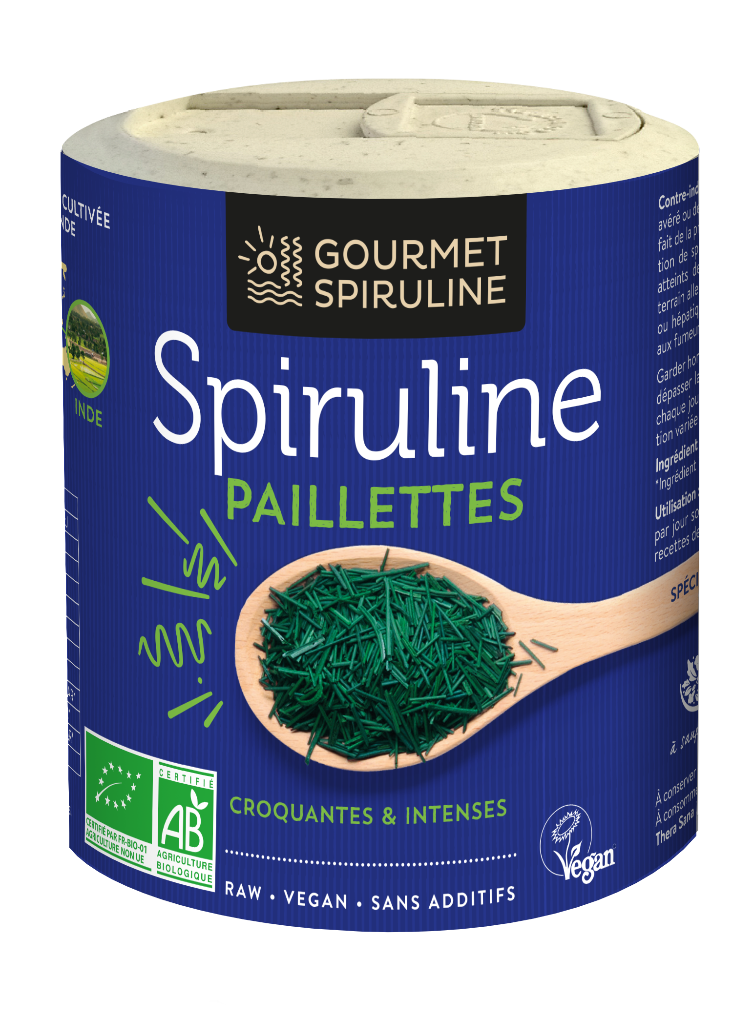 Gourmet Spiruline propose depuis plusieurs années des paillettes de spiruline. Grâce à une collaboration étroite avec un producteur indien, la marque va plus loin en lançant des paillettes certifiées Agriculture Biologique d’une grande qualité nutritionnelle et gustative.