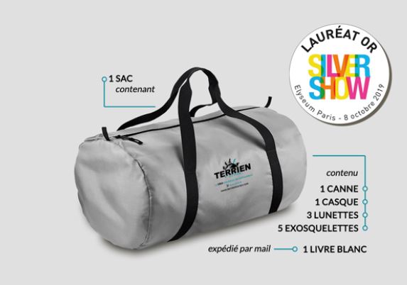 Le produit consiste en 1 kit facile à transporter, grâce à son sac, contenant 1 casque simulant la presbyacousie, 3 lunettes simulant la cataracte, le glaucome et la DMLA (ces 3 paires représentant 90 % des cas de la vision du grand-âge), ainsi qu’une canne et 5 exosquelettes simulant les problèmes de motricité.
