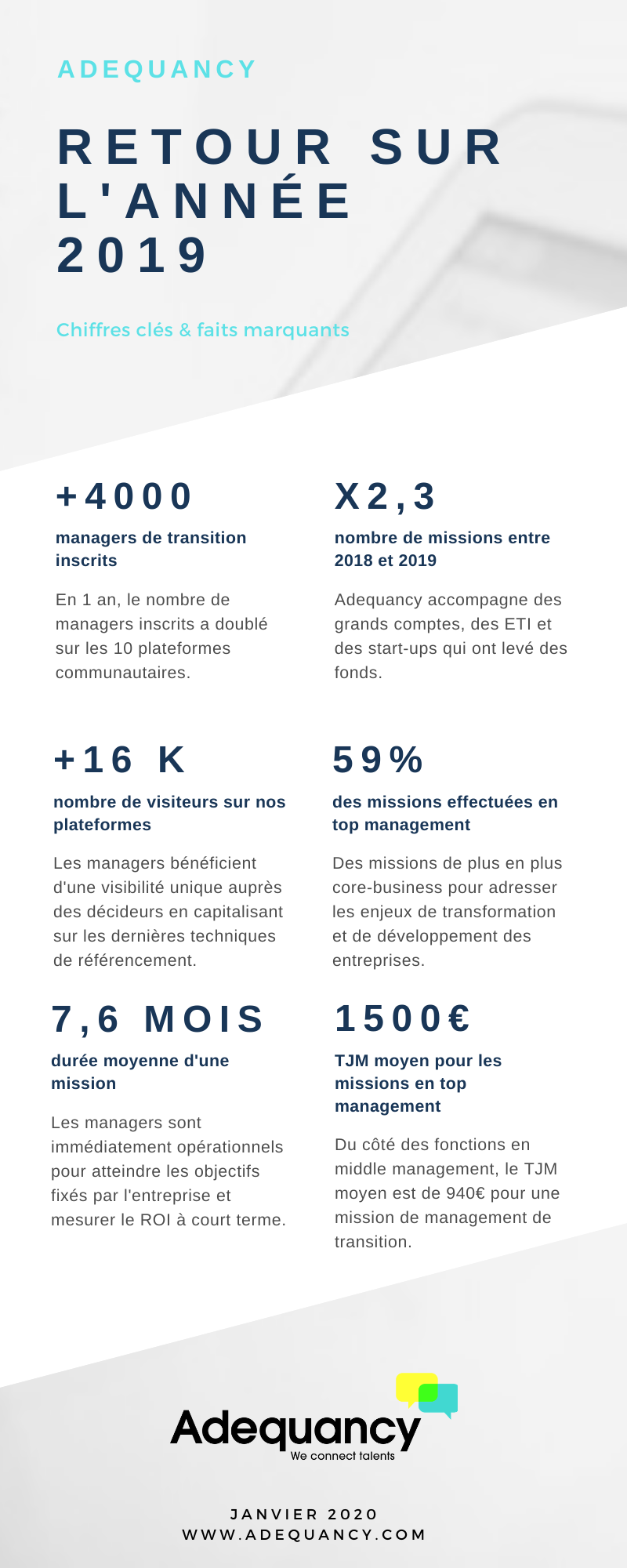 Adequancy s’adresse à tous les managers de transition. Chacun se retrouve au même niveau. Les critères humains et les compétences recherchés par les décideurs font la différence. 2019 a été une belle année de développement pour Adequancy grâce à nos équipes engagées, à nos clients et managers de transition qui portent leur confiance vers un modèle innovant sur un marché résolument traditionnel.