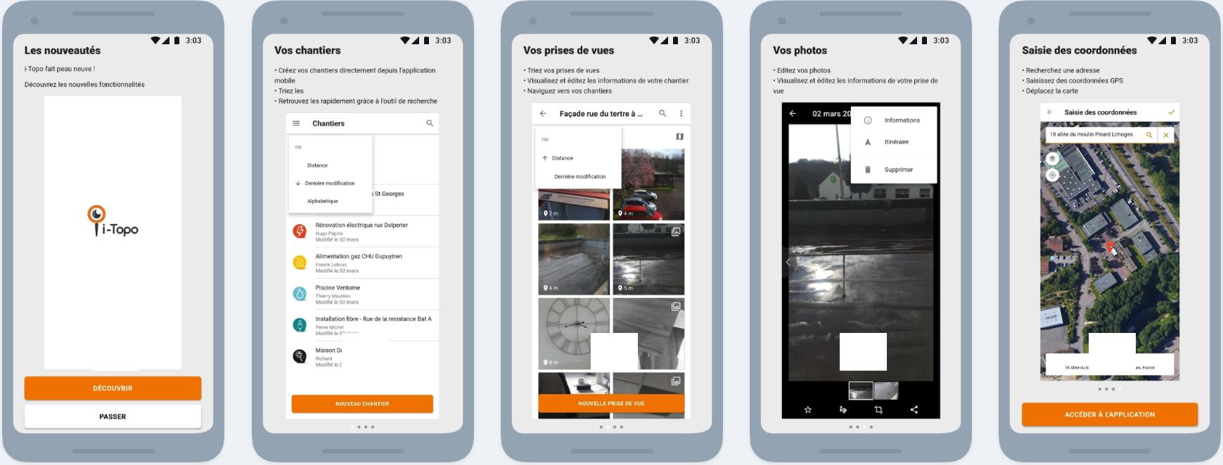L’application mobile i-Topo est disponible sur IOS et Android et est totalement gratuite. Les clients peuvent donc gagner du temps et gérer leurs chantiers encore plus facilement, grâce à cette nouvelle version et ses fonctionnalités innovantes :