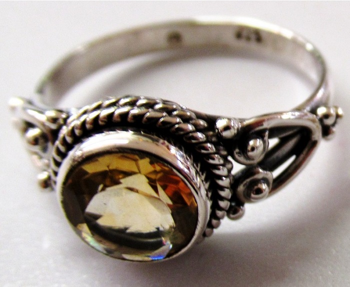 Cette superbe bague, très élégante, est sertie d’une citrine. Cette gemme est celle de la joie, elle est un puissant nettoyant et régénérateur car dotée du pouvoir solaire. Prix : 25 €.
