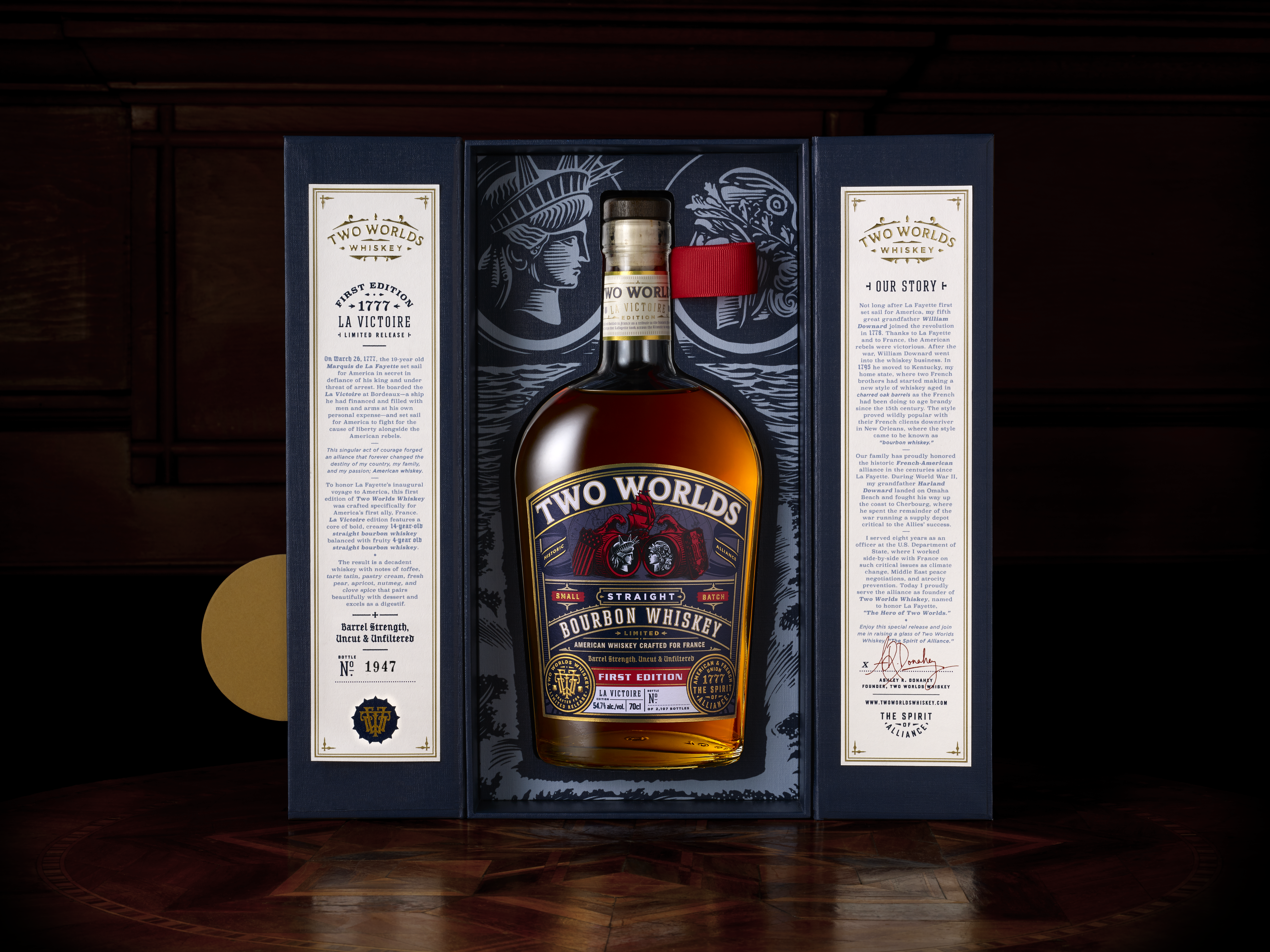 C’est pour rendre hommage au voyage inaugural de La Fayette en Amérique que la Présidente et Fondatrice de Two Worlds Whiskey lance une première édition de whiskey américain d’exception spécialement créée pour l’allié historique de l’Amérique, la France.