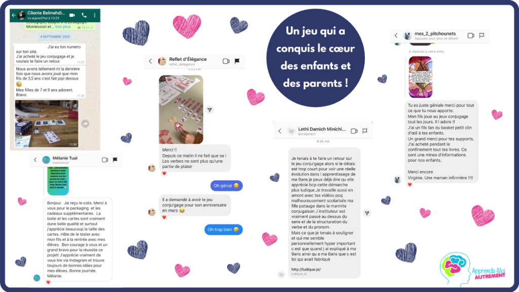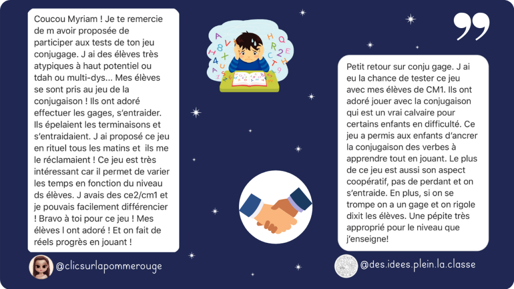 Conju’Gage a été testé et amélioré par des maîtresses de l’Education Nationale, mais aussi par des mamans d’enfants DYSfférents.