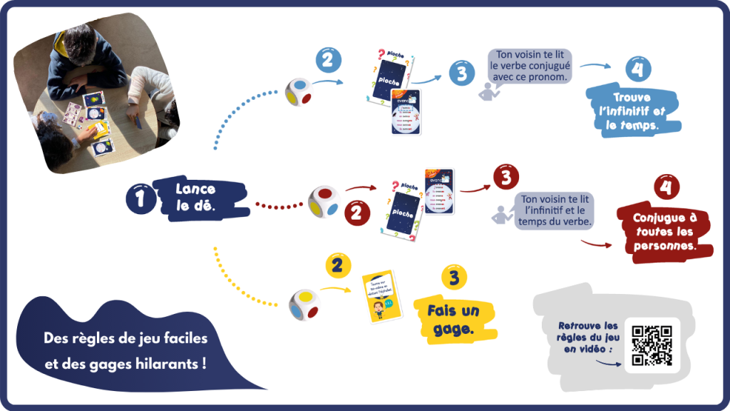 Sauf que peu d’enfants sont enthousiastes face à la conjugaison. Alors on a inventé un jeu ludique hyper drôle, qui provoque des fous rires alors qu’on fait de la conjugaison.