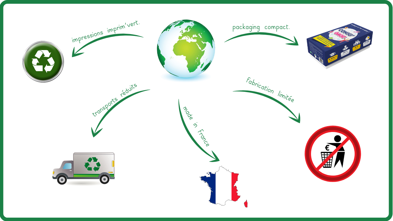 Tout a été pensé pour minimiser l’impact sur l’environnement du jeu : la fabrication locale diminue la pollution liée au transport, le nombre d’exemplaires est limité pour éviter tout gaspillage, les impressions sont réalisées par un partenaire certifié Imprim’Vert et le packaging est volontairement compact.