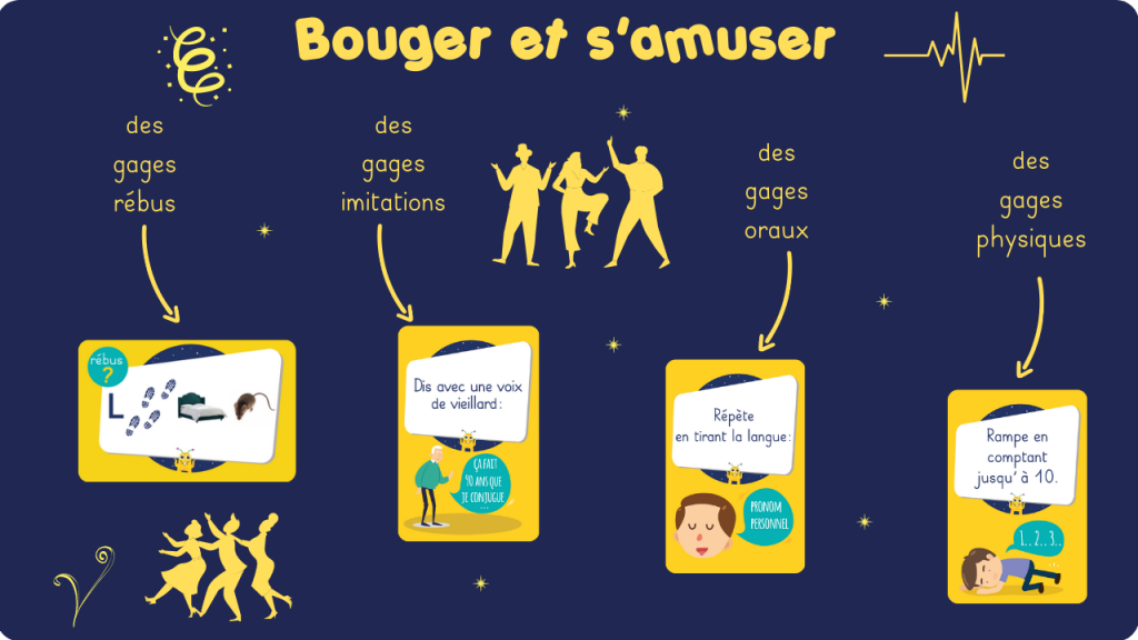 Tout le monde peut avoir un gage hilarant, même les adultes qui maîtrisent parfaitement la conjugaison. Autant dire que les fous rires sont garantis ! Et comme tout le monde s’amuse, les enfants participent volontiers, ils apprennent sans s’en rendre compte.