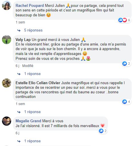 De 2013 à 2017, il sillonne ainsi la planète en autofinancement pour récolter des pépites de sagesse qu’il partage ensuite avec le plus grand nombre. Au vu du succès rencontré par le film “C’est quoi le bonheur pour vous ?”, Julien aimerait qu’il soit diffusé sur les chaînes de télévision afin de démocratiser davantage l’accès au bonheur.