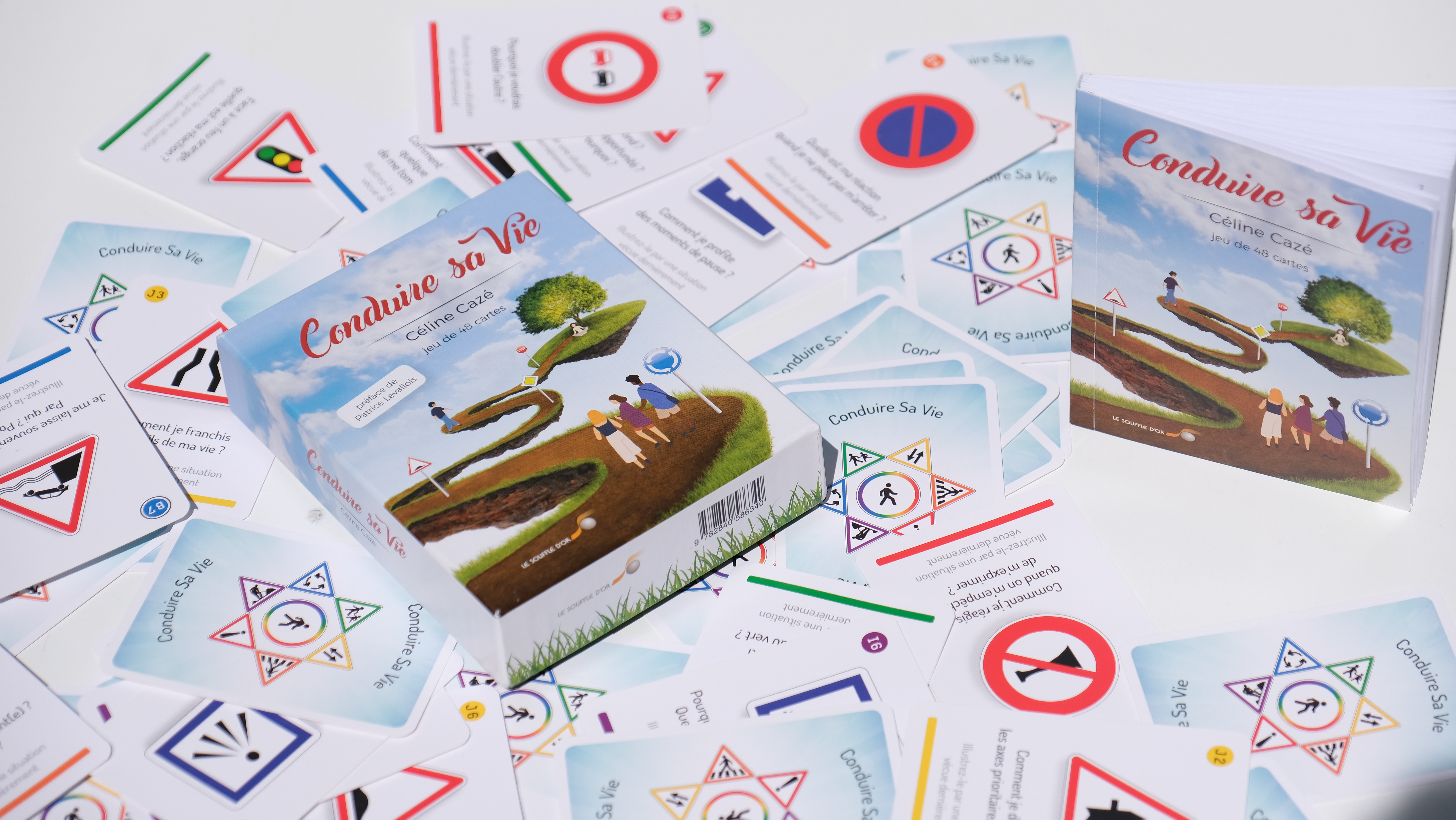 Conduire sa Vie est composé d’un jeu de 48 cartes et d’un livret de 96 pages. C’est un jeu coopératif, accessible et joyeux, qui peut être utilisé en famille, entre amis, ou entrer dans la démarche de thérapeutes et de professionnels de l’accompagnement.