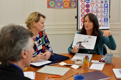 Son objectif est double : il permet en quelques minutes de faire émerger un sujet de conversation personnel favorisant le partage et l’entraide, et aussi d’envisager d’une nouvelle manière la signification des panneaux de signalisation routière.