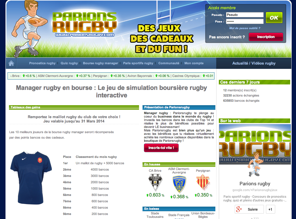 Dédié aux fans de rugby, le nouveau site parionsrugby.com rassemble pour la 1ère fois sur le web, tout ce dont les amateurs ont toujours rêvé : de l’actualité, un forum, des jeux et pronostics sur les plus grands matchs de championnats, Top 14, Pro D2, H-Cup, 6 Nations…, le tout gratuit !