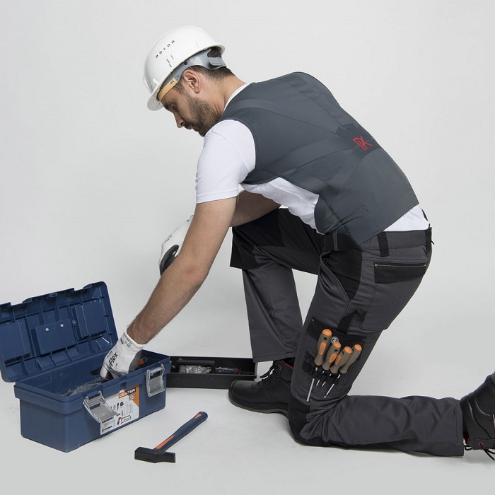 Le concept est parfaitement fonctionnel et “sans prise de tête”. Concrètement, si le salarié se penche trop en avant, des tenseurs incorporés dans le tissu vont l’inviter à se redresser et à conserver la posture adéquate (la colonne en S).