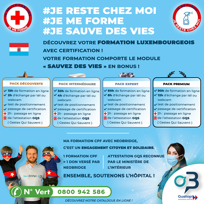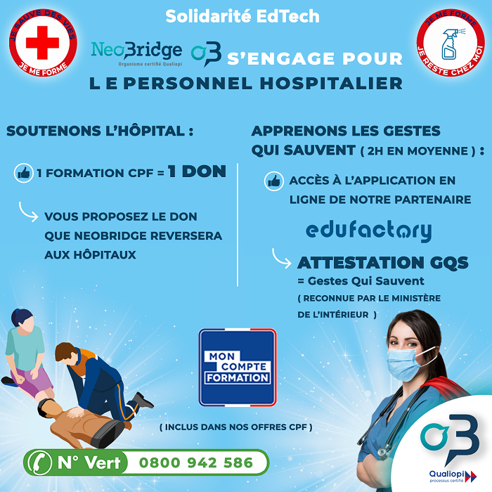 C’est dans ce contexte que Neobridge, expert de la formation en ligne certifié Qualiopi, soutient le personnel hospitalier en lui reversant des dons et offre dans chaque formation CPF une formation aux gestes qui sauvent (délivrant l’attestation GQS reconnue par le Ministère de l’Intérieur).