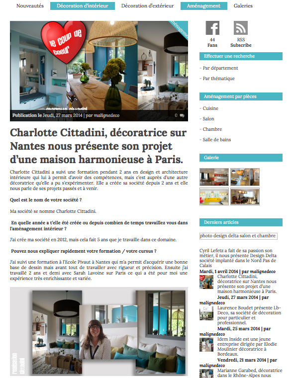 « Décoratrice d’intérieur, je me suis inscrite sur malignedeco car le site est spécialisé dans la décoration d’intérieur et permet de cibler des lecteurs et lectrices intéressés par ce domaine si passionnant. J’ai trouvé le site limpide, pragmatique, esthétique (…), l’interview était précise, professionnelle, spécialisée et la présentation des visuels de mes réalisations bien pensée… »