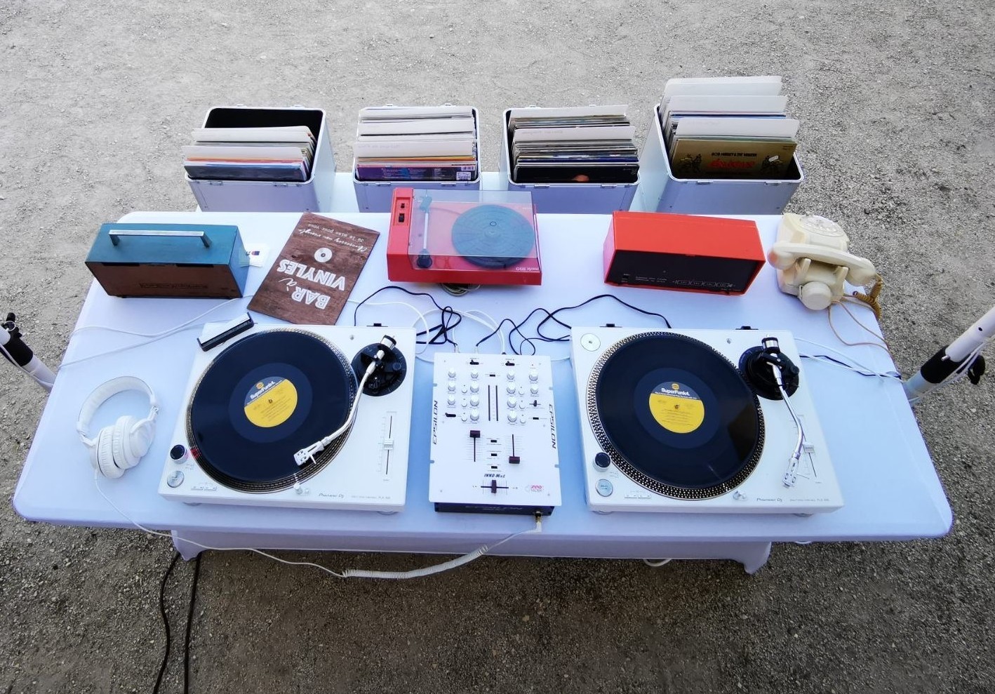 La mise en scène de l’espace DJ a été pensée de façon globale, fixée par des accessoires typiquement rétro comme un appareil photo Polaroid®, un ancien poste transistor, un téléphone à cadran rotatif orange vif ou encore un pouf tam-tam.