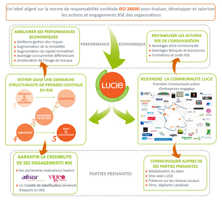 Le label LUCIE permet d’authentifier l’engagement RSE des entreprises et de les accompagner dans une démarche de progrès continu. Pour l’obtenir, il faut répondre à un cahier des charges comprenant 28 principes d’action regroupés en 7 engagements qui correspondent aux questions centrales de la norme ISO 26 000 :