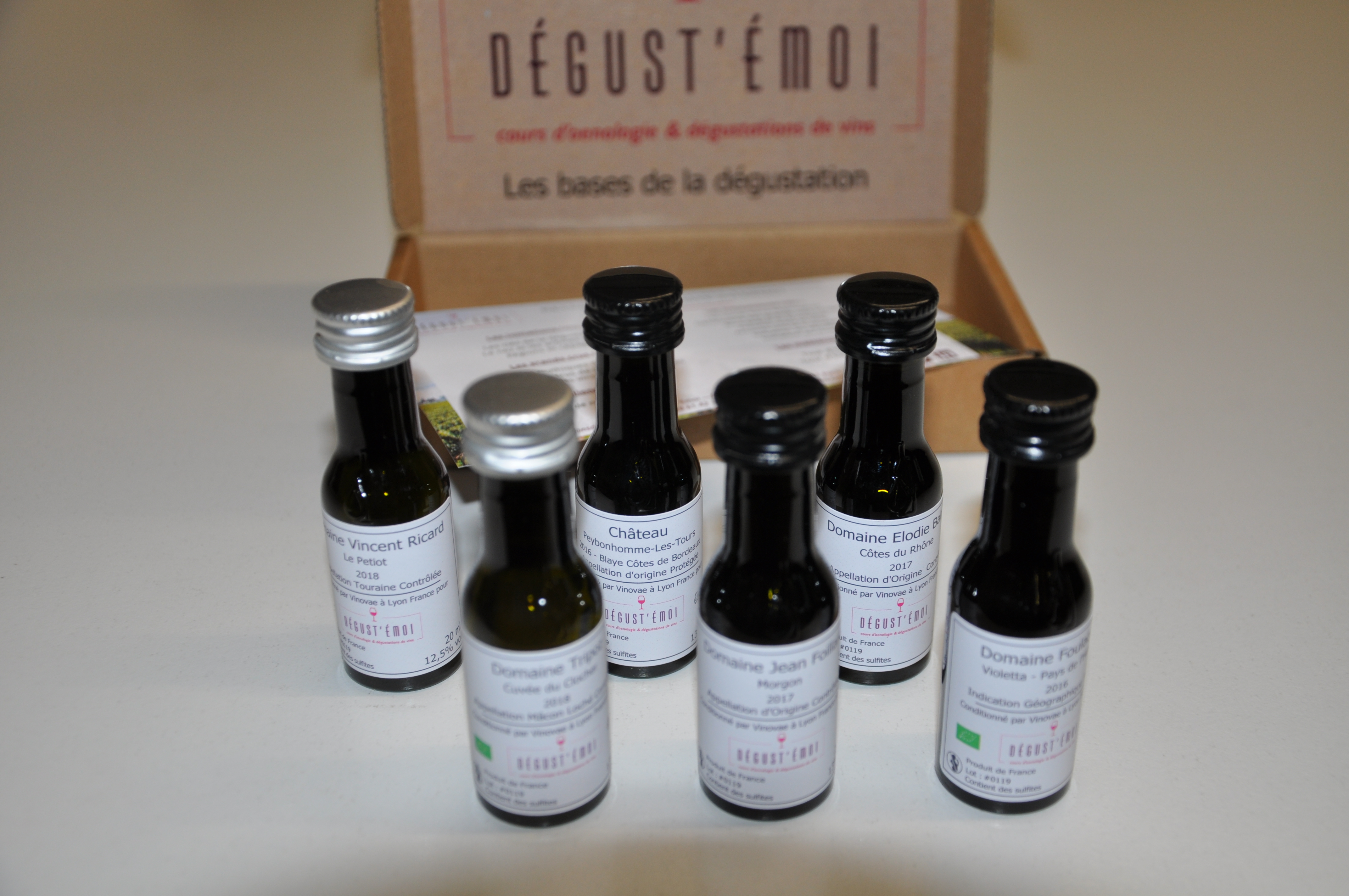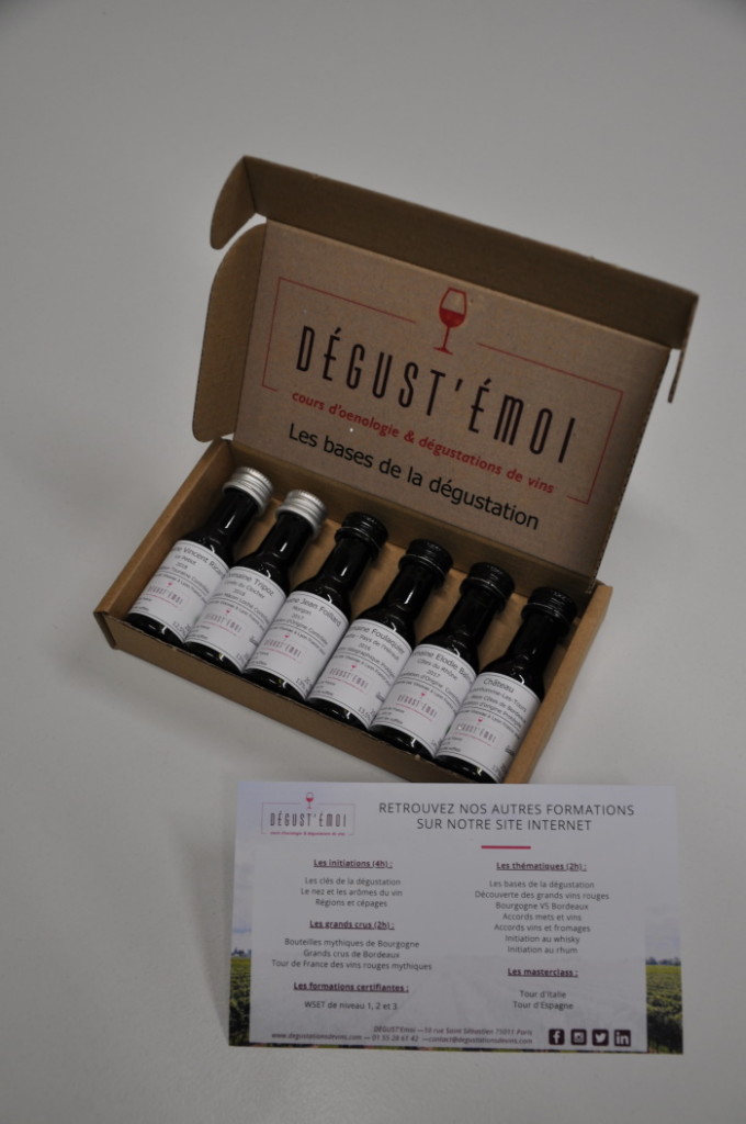 Après l’inscription, les stagiaires reçoivent à leur domicile un coffret de dégustation. Les dégustations et analyses des vins qu’il contient sont visibles sous forme de vidéos et de fiches dégustation sur l’Académie en ligne. DEGUST’Emoi propose également des coffrets cadeaux pour ses cours en ligne de 2 heures et 4 heures.