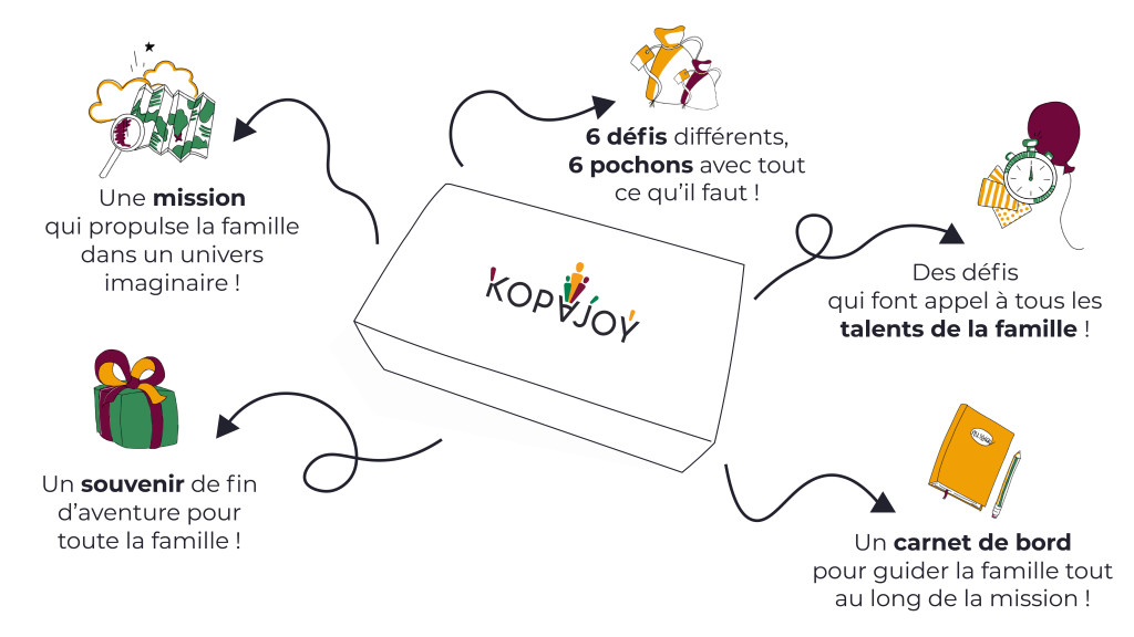 Le “labo des familles”, le lieu de rencontre et d’échange entre les familles et l’entreprise Kopajoy, permet à cette dernière de développer des produits adaptés aux besoins des familles. Ainsi, Kopajoy offre aux familles des aventures ludiques et fédératrices qui se déclinent sous forme de coffret-aventure.