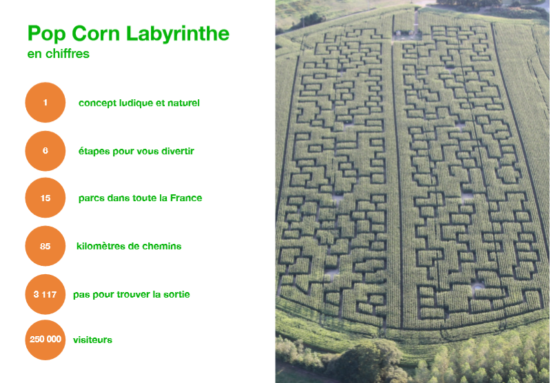 Pop Corn Labyrinthe propose aux Français de s’amuser, de se défier et de rêver au sein d’immenses labyrinthes géants, dessinés parmi des champs de maïs.