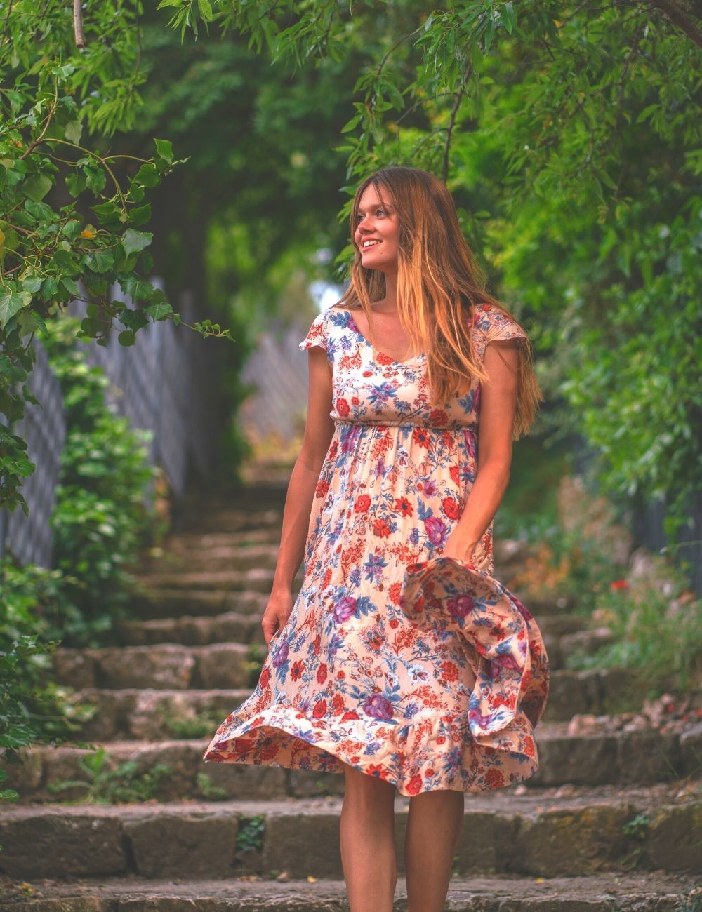 La robe Josy est une robe rose blush indémodable ultra féminine avec sa coupe empire ajustée sous la poitrine. Très facile à porter au quotidien ou pour une soirée, elle est de le longueur mi-longue avec un joli volant sur le bas.