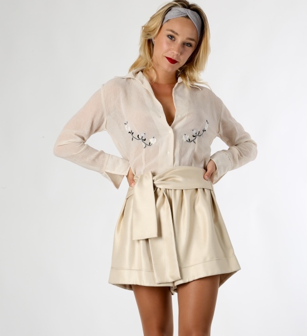 Le short Noué M, en natté 100% soie, en forme corolle, est dans la mouvance actuelle de la jupe courte de la « ballerine ». Et si féminin, si intemporel.