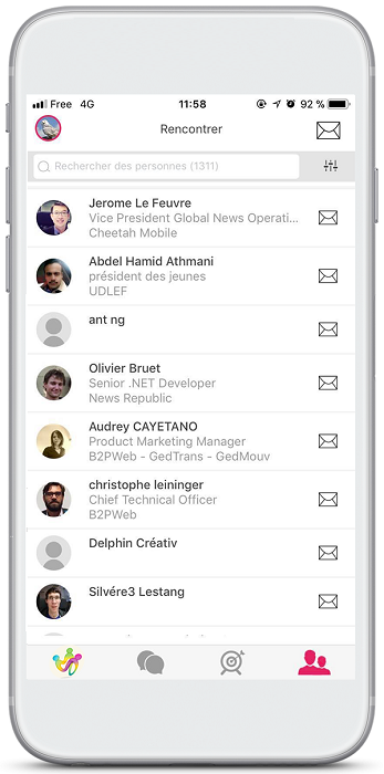 - Network : Rechercher précisément des participants grâce à la fonction filtre, visiter des profils et entrer en relation.