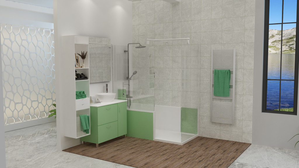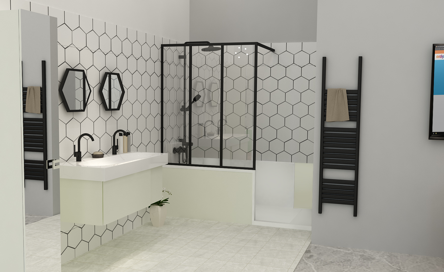 Evolyo fournit une simulation 3D réaliste de la douche implantée dans la salle de bains, sur simple envoi de photo. Il n’y a donc aucun risque d’erreur, chacun.e sait exactement à quoi s’attendre.