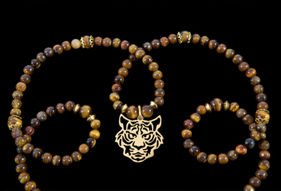 En quête d’harmonie et de spiritualité avec elle-même, elle privilégie les perles en bois, en peau de serpent et les pierres dont les vertus sont universellement reconnues.